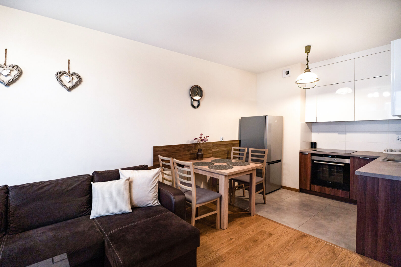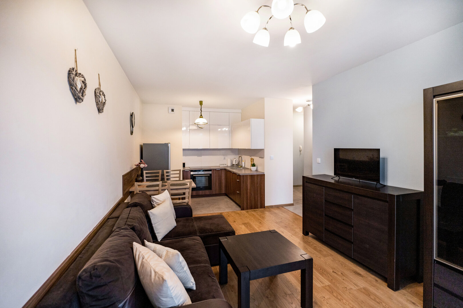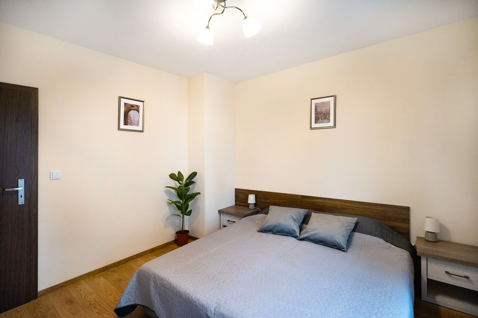 Apartament składa się z osobnej sypialni z dużym, wygodnym łóżkiem małżeńskim, przestronnego salonu z aneksem kuchennym oraz wyjściem na balkon, z którego można podziwiać miasto z wysokości. Aneks wyposażony jest we wszystko, co potrzebne do przygotowania posiłków. W apartamencie znajduje się również nowoczesna łazienka z prysznicem oraz pralka.