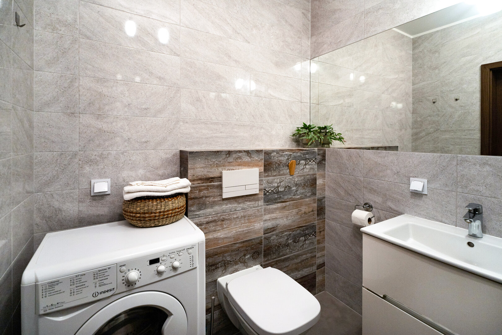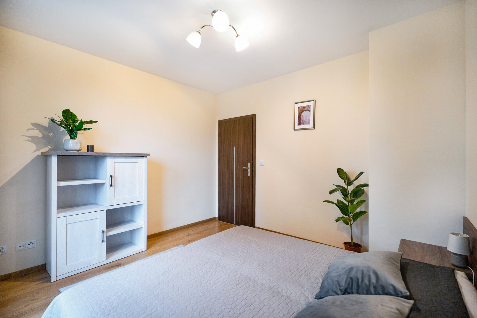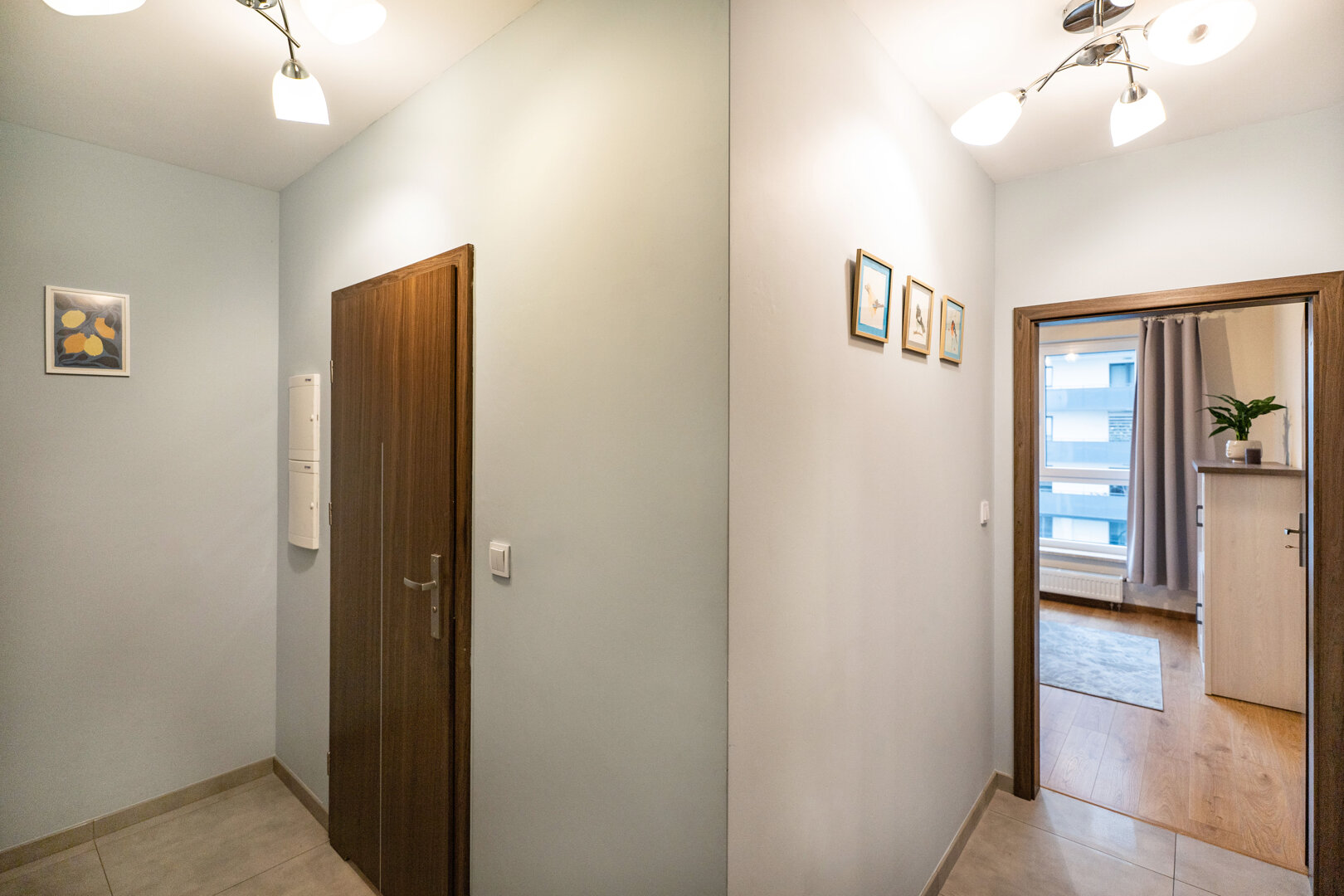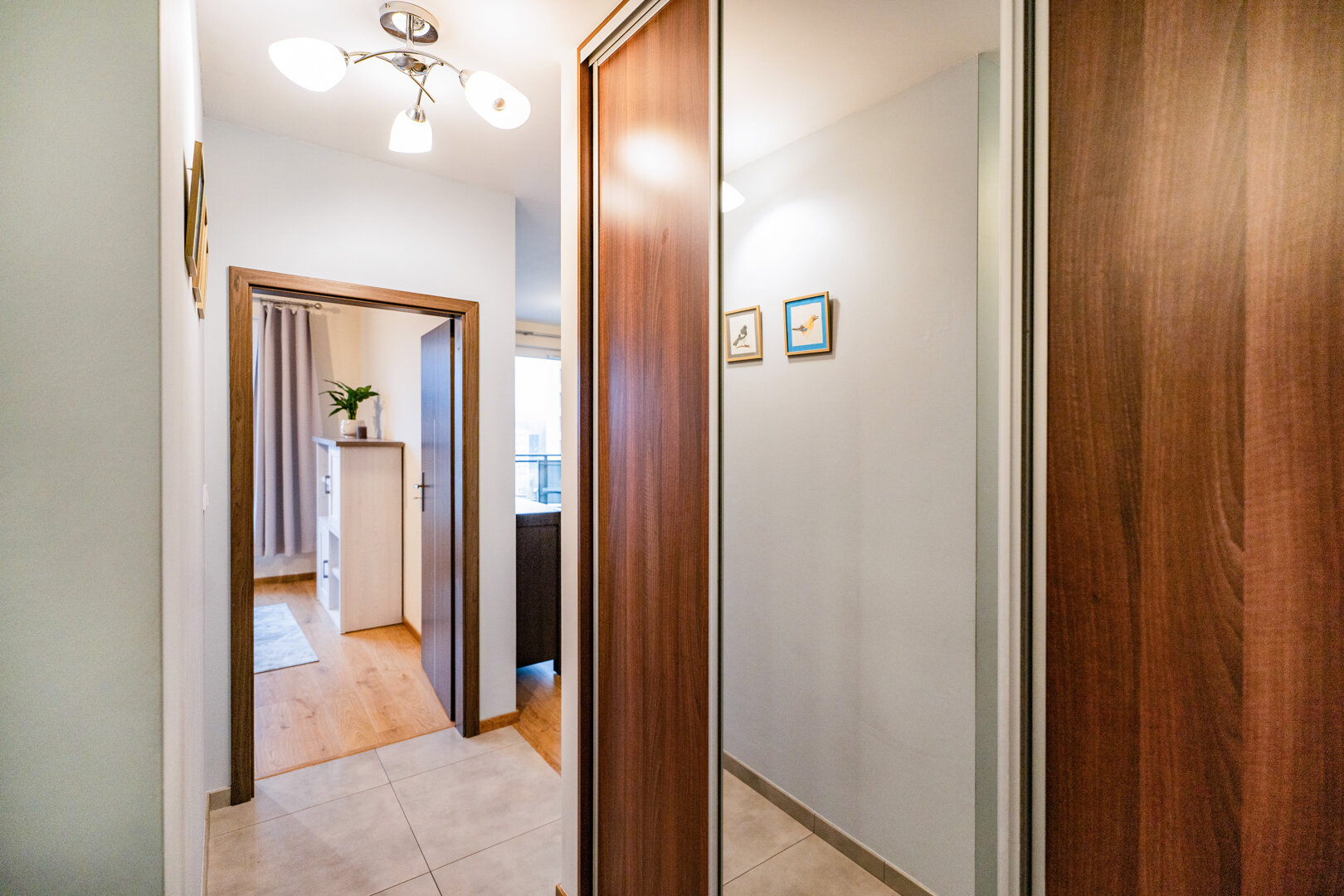 Apartament składa się z osobnej sypialni z dużym, wygodnym łóżkiem małżeńskim, przestronnego salonu z aneksem kuchennym oraz wyjściem na balkon, z którego można podziwiać miasto z wysokości. Aneks wyposażony jest we wszystko, co potrzebne do przygotowania posiłków. W apartamencie znajduje się również nowoczesna łazienka z prysznicem oraz pralka.