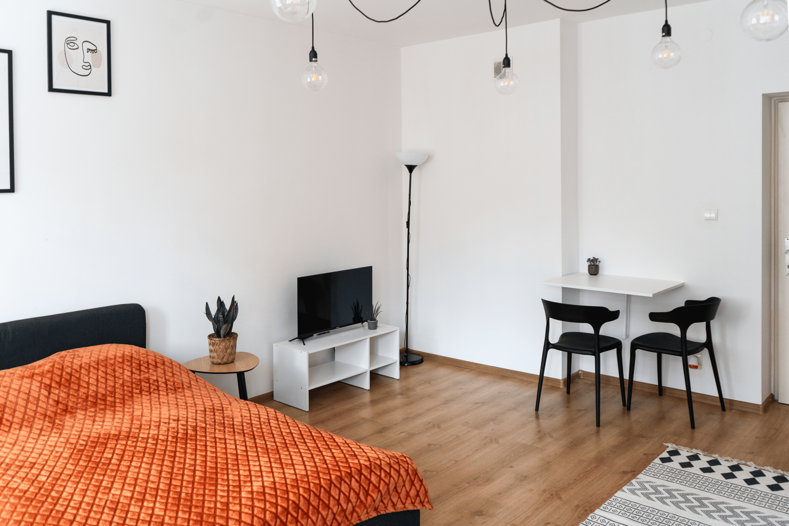 Nowa, stylowa kawalerka z balkonem i klimatyzacją. W apartamencie znajduje się wygodne łóżko oraz rozkładana sofa dla dodatkowych gości. Jasne, nowoczesne wnętrze zapewnia komfortowy pobyt zarówno na krótki, jak i dłuższy wyjazd.