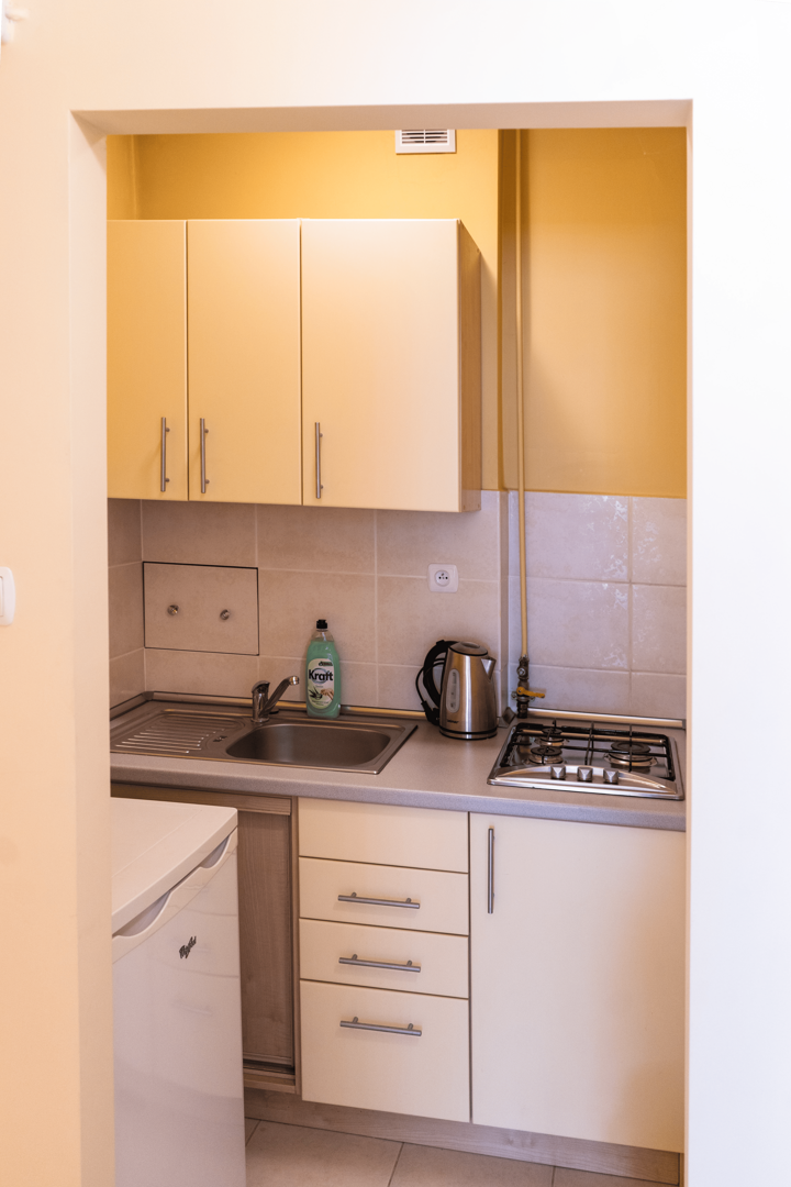 Ten apartament z oddzielnym wejściem mieści salon, oddzielną sypialnię oraz łazienkę z prysznicem i suszarką do włosów. Udogodnienia obejmują doskonale wyposażoną kuchnię z płytą kuchenną, lodówką oraz przyborami kuchennymi. Do dyspozycji Gości jest pralk