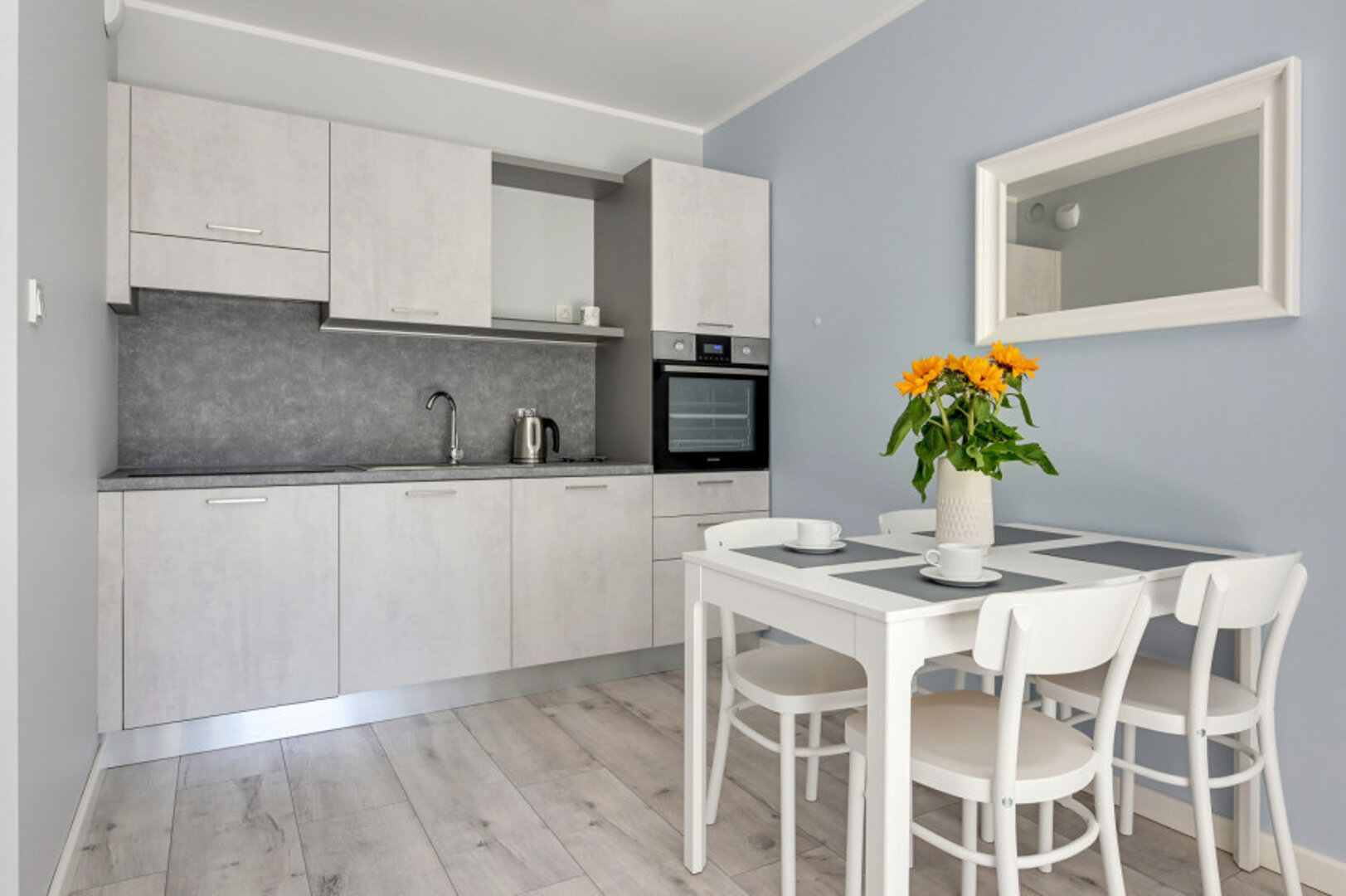 Nowa, stylowa kawalerka z balkonem i klimatyzacją. W apartamencie znajduje się wygodne łóżko oraz rozkładana sofa dla dodatkowych gości. Jasne, nowoczesne wnętrze zapewnia komfortowy pobyt zarówno na krótki, jak i dłuższy wyjazd.