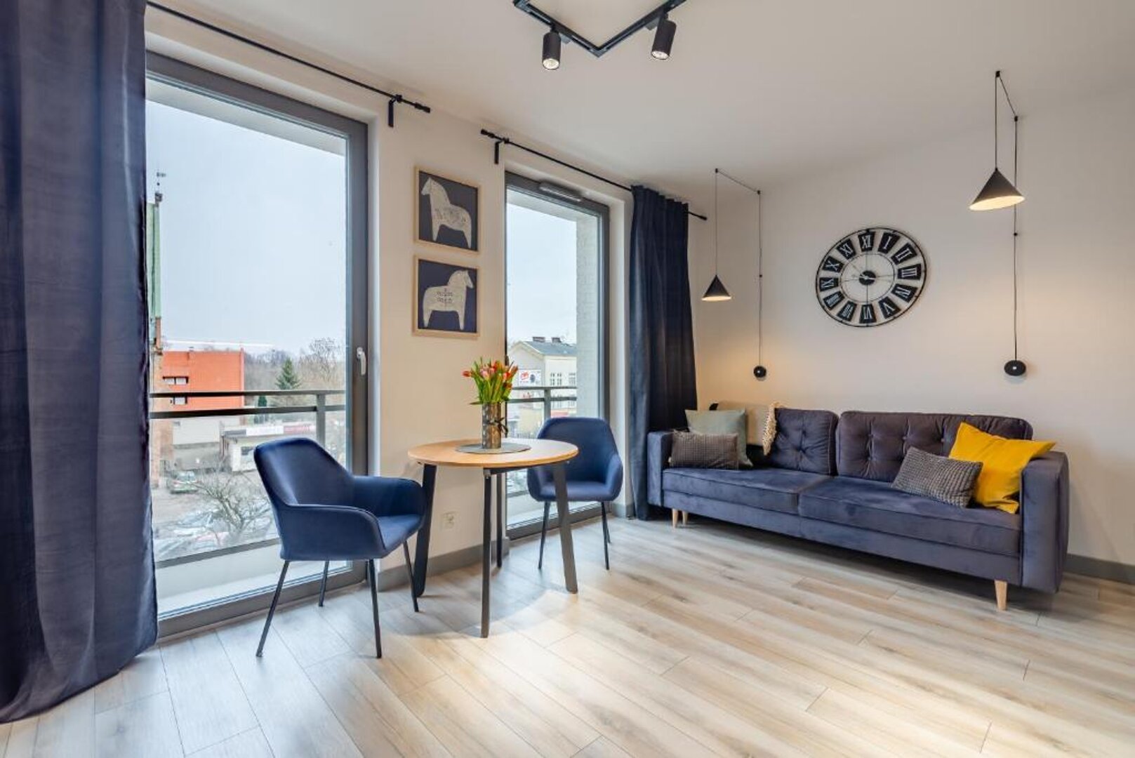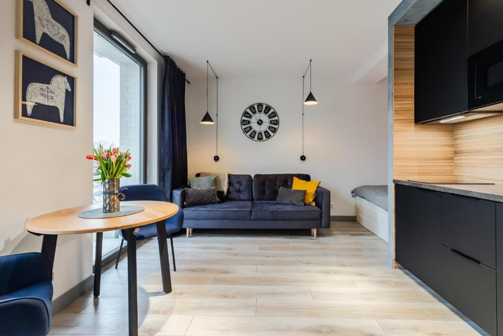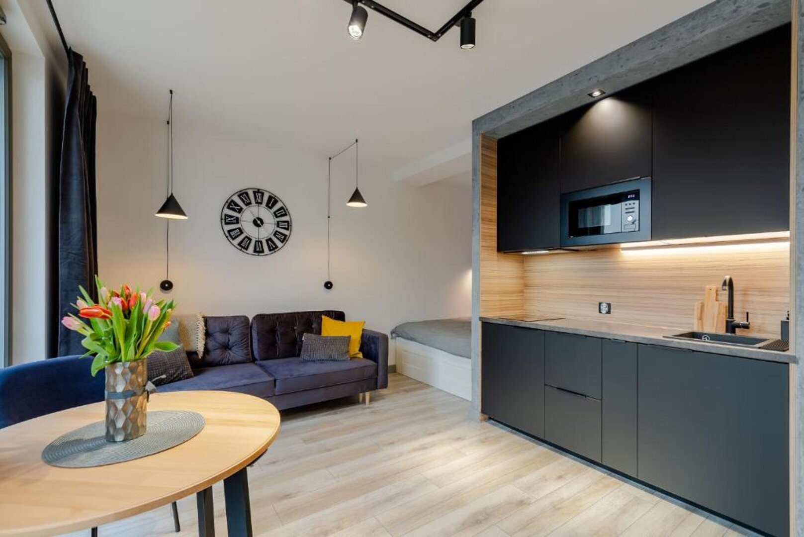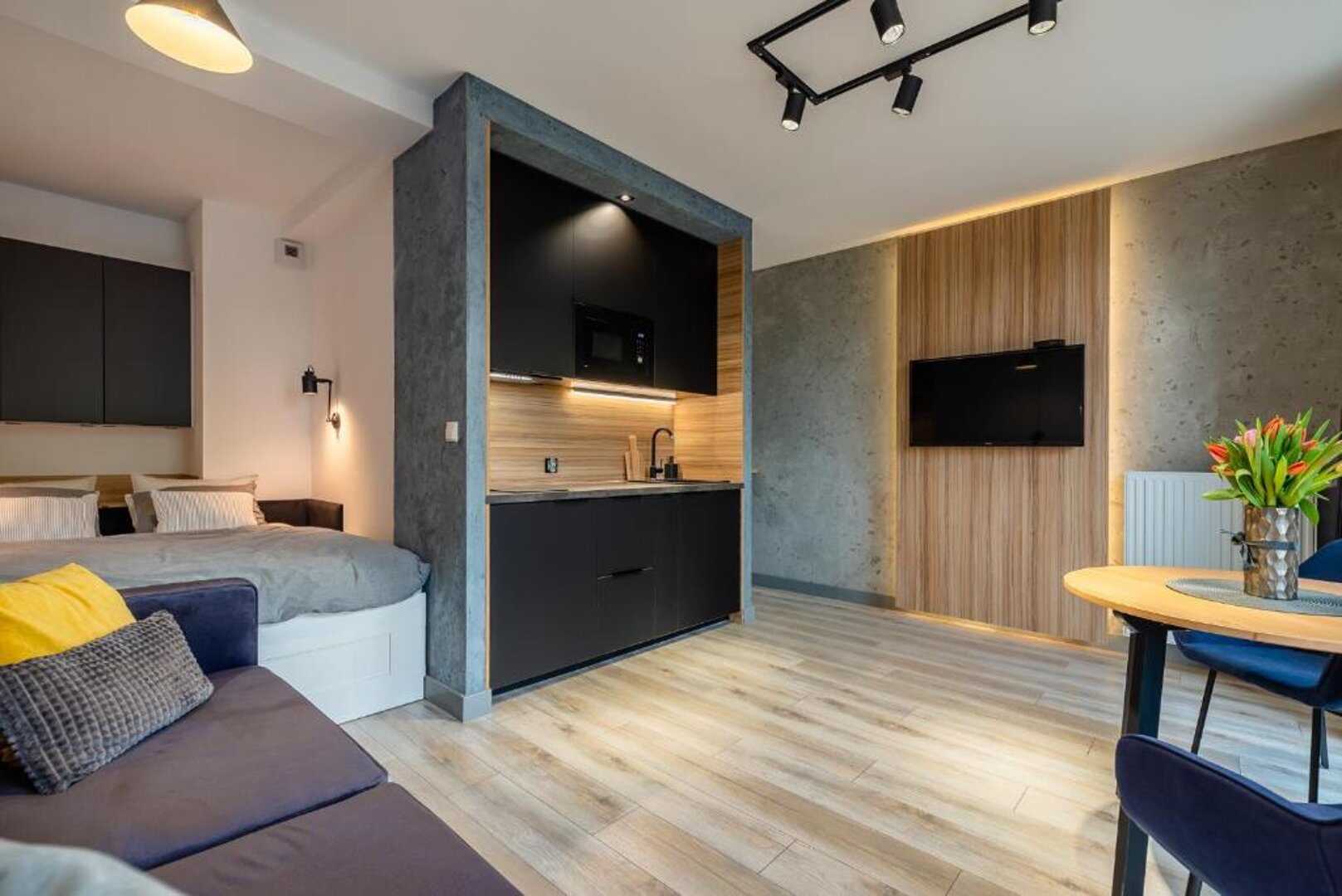 Nowa, stylowa kawalerka z balkonem i klimatyzacją. W apartamencie znajduje się wygodne łóżko oraz rozkładana sofa dla dodatkowych gości. Jasne, nowoczesne wnętrze zapewnia komfortowy pobyt zarówno na krótki, jak i dłuższy wyjazd.