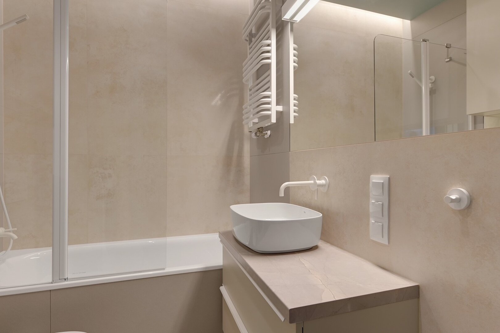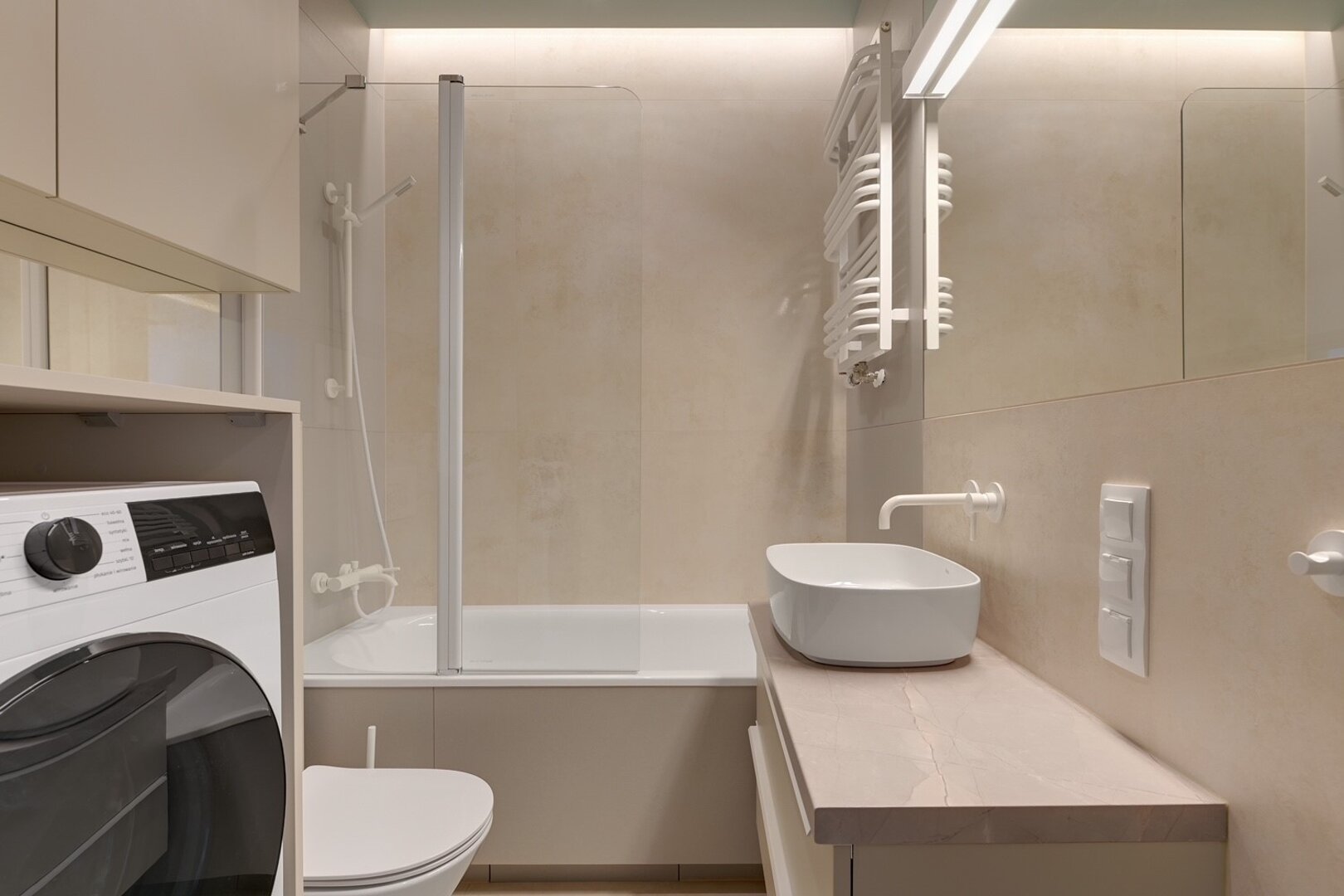 – Stylowa łazienka z prysznicem i pralką.
