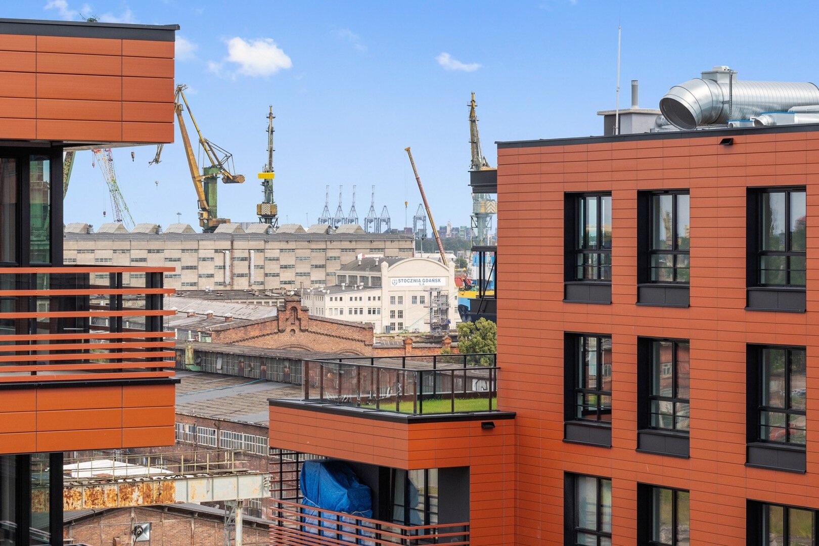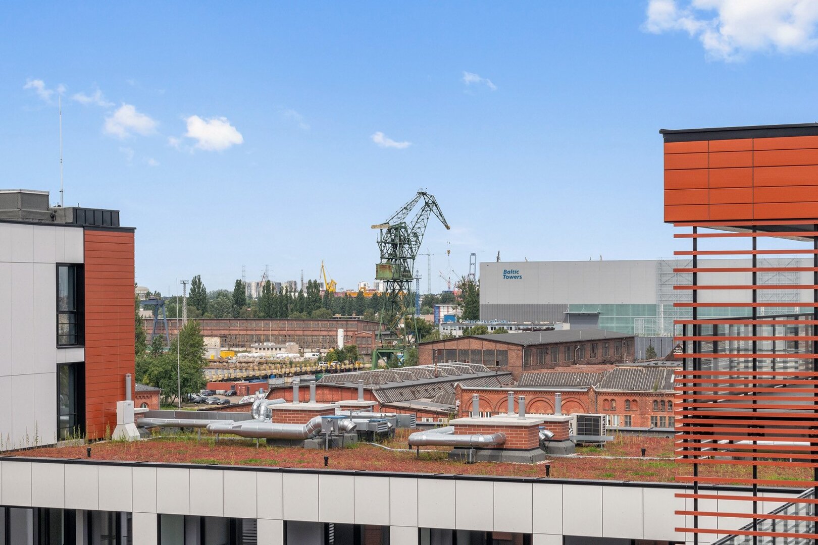 Nowoczesne studio na 7. piętrze z widokiem na stocznię, położone przy ul. Popiełuszki w Gdańsku. W pełni wyposażony aneks kuchenny, elegancka łazienka, komfortowa część wypoczynkowa i doskonała lokalizacja.